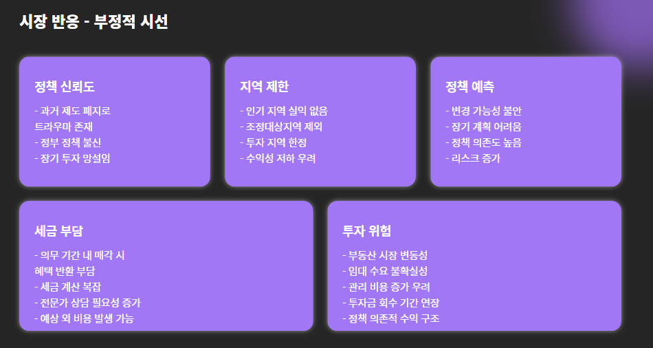 - 정책 신뢰 부족: 과거 제도 폐지 → 세금폭탄 사례로 트라우마