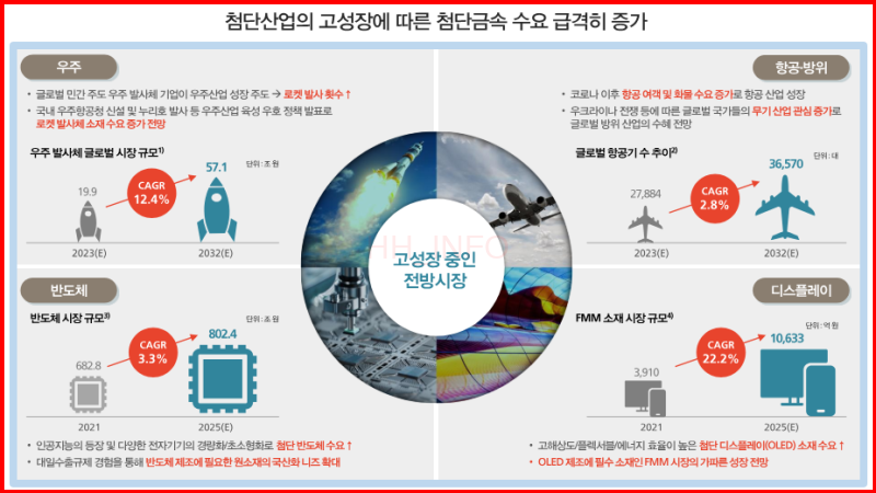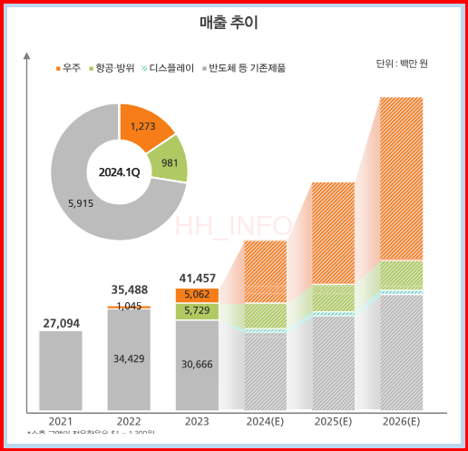 에이치브이엠은 다양한 첨단산업에 적용되는 고기능성 첨단 금속을 생산하는 기업이에요. 2021년에는 매출의 대부분이 반도체에 집중되어 있었지만, 최근에는 우주, 항공, 디스플레이 등 다양한 산업에서 매출이 발생하며 다각화에 성공했어요. 또한, 소재, 부품, 장비산업 100대 강소기업에 선정되며 기술력을 인정받았습니다.