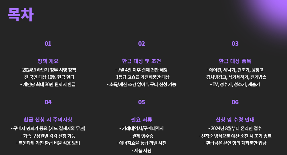 이번 정책은 7월 4일 이후 1등급 고효율 가전을 구매한 전 국민을 대상으로 10% 현금 환급을 지원하며, 개인당 최대 30만 원까지 환급받을 수 있습니다.