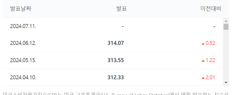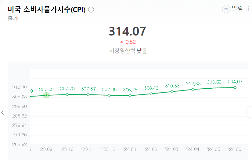 6월 CPI는 한국 시간으로 7월 11일 오후 9시 30분에 발표될 예정입니다. 시장에서는 6월 CPI를 3.1%로 예상하고 있는데, 이는 전월 3.3% 대비 0.2%p 감소한 수치입니다.