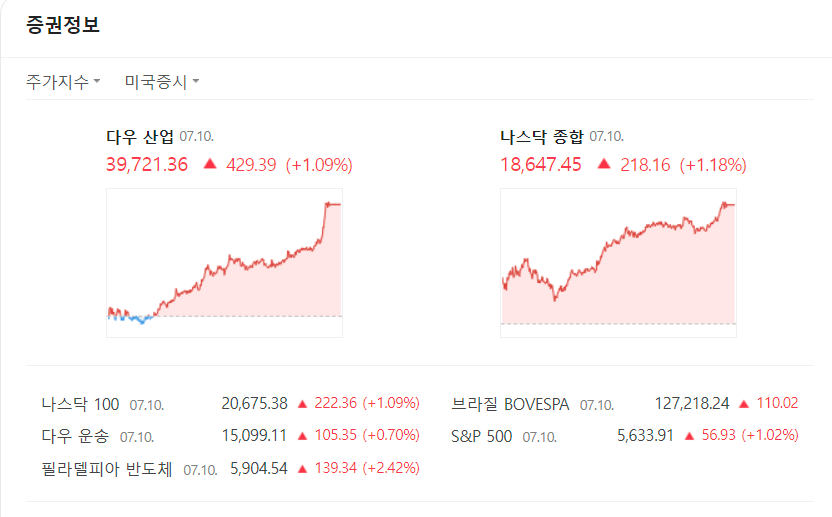 현재 글을 쓰고 있는 시각에 미국 증시는 강세를 보이고 있습니다. 다우산업지수는 일부 하락하고 있으나 나스닥과 S&P 500은 각각 0.42%, 0.22% 상승하고 있습니다. S&P 500 지수는 개장 직후 5,583.11, 나스닥 지수는 18,416.94에 역대 최고치를 다시 경신했습니다.