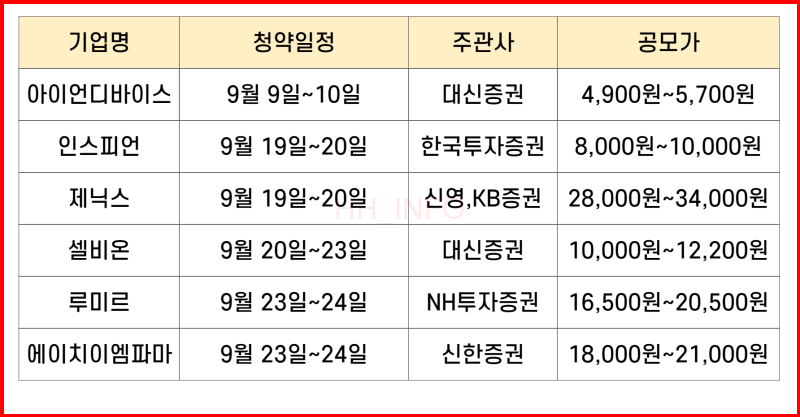9월 공모주 청약 일정 미래에셋비전7호스팩 아이언디바이스 키움제9호스팩 인스피언 제닉스 셀비온 루미르 에이치이엠파마 와이제이링크 씨메스 알아보자!