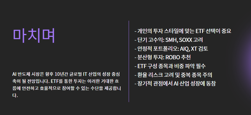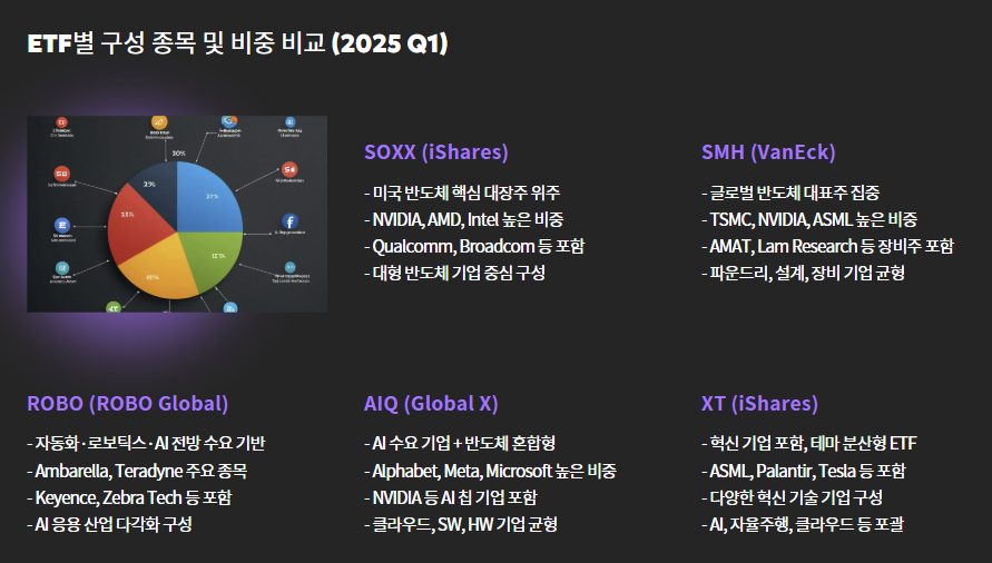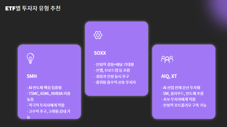 | AIQ | Alphabet, Meta, Microsoft, NVIDIA | AI 수요 기업+반도체 혼합형 |