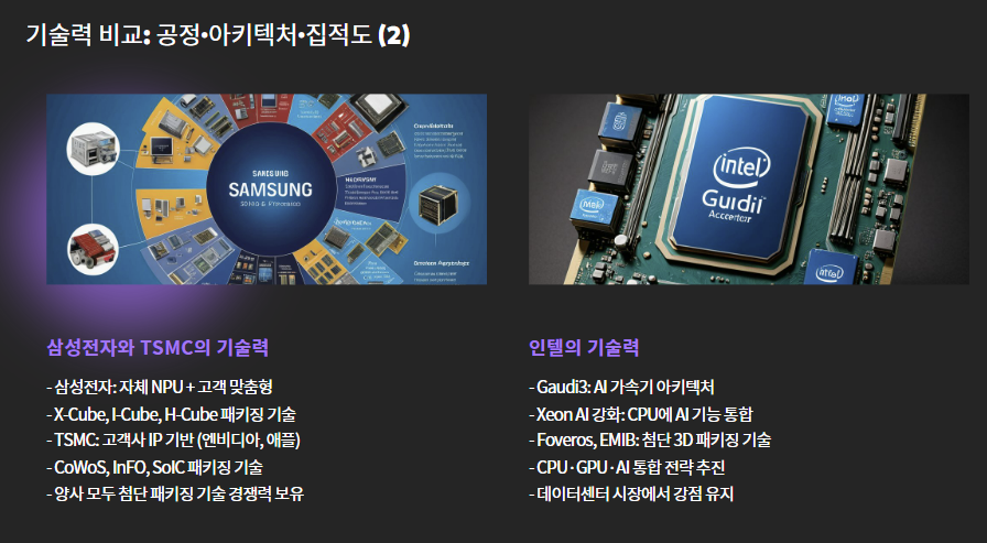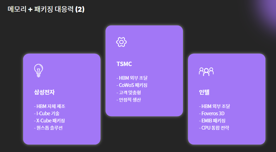 | 패키징 기술 | I-Cube, X-Cube (HBM 3D통합형 패키징) | CoWoS (TSMC 대표 기술) | Foveros 3D, EMIB |