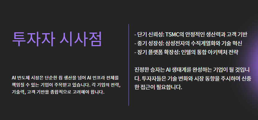 | TSMC | 세계 최정상 고객에 집중, 수율·신뢰로 승부 | 자체 AI칩 부재, 메모리 의존 |