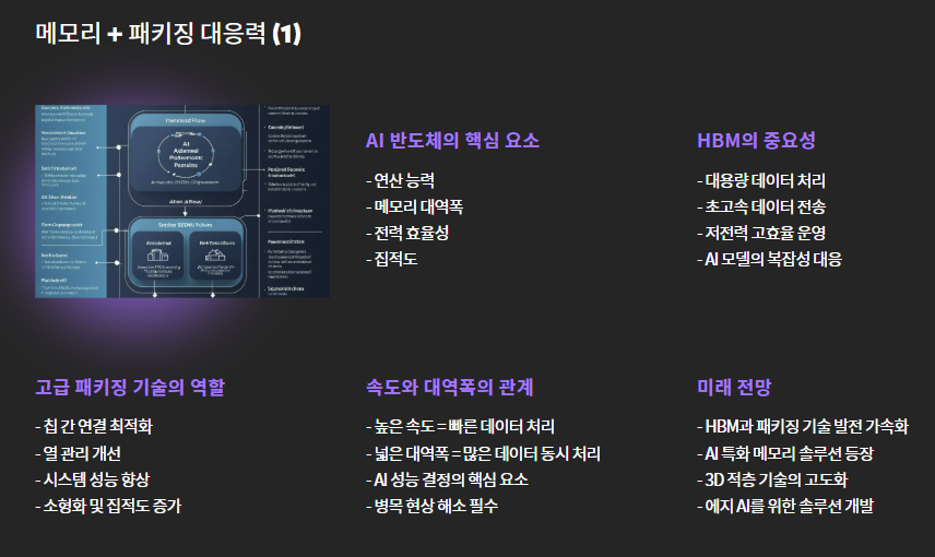 그래서 HBM(고대역폭 메모리) + 고급 패키징 기술이 필수입니다.