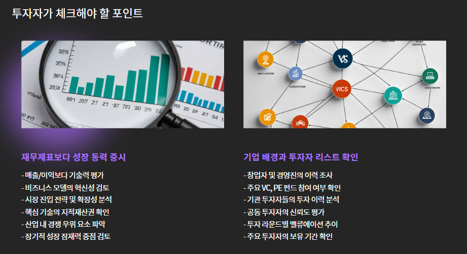 - 매출이나 이익이 아닌, 기술력·BM(비즈니스모델)·시장성 체크