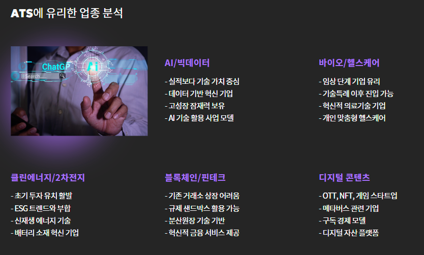 | 바이오/헬스케어 | 임상 단계 기업, 기술특례 이후 ATS 진입 가능 |