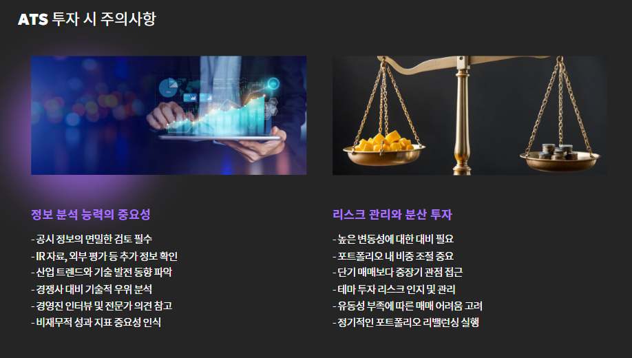 따라서 분산 투자와 포트폴리오 내 일부만 ATS 종목으로 운영하는 전략이 유효합니다.