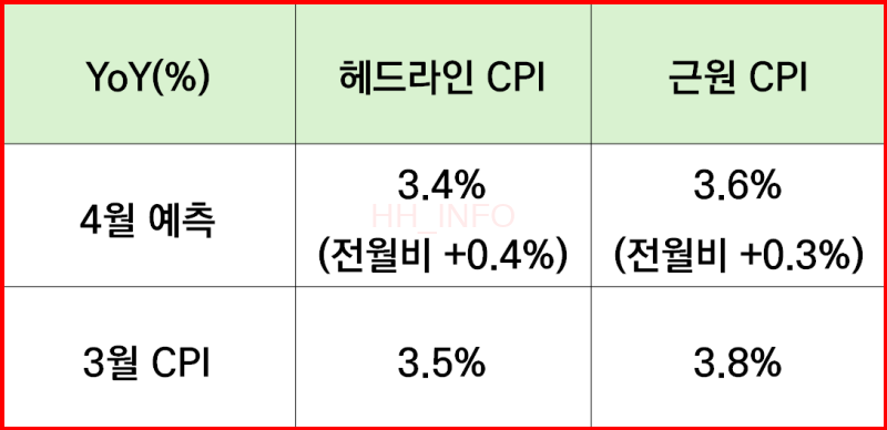 4월에는 헤드라인 CPI가 3.4%, 근원 CPI가 3.6%로 예상됩니다. 이는 전월 대비 각각 0.1%포인트, 0.2%포인트 하락한 수치입니다. 예측치가 보수적으로 잡혀 있어, 실제 수치가 더 낮게 나오면 증시에 긍정적인 영향을 줍니다. 반대로 예측치를 상회하면 증시는 하락할 것입니다.