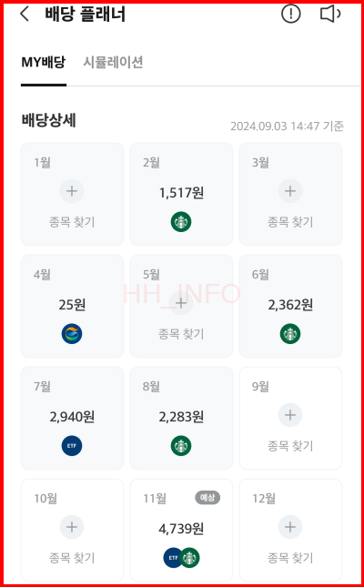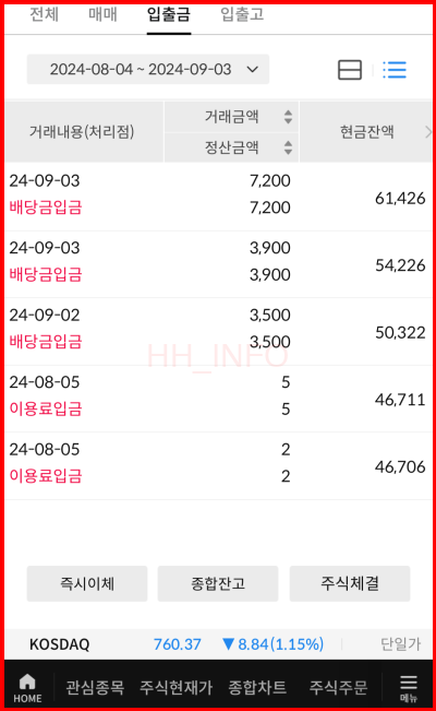 만약 3개월 배당 상품을 보유하고 있는 경우, 이번 달에는 배당이 이루어지지 않고 10월에 배당이 이루어집니다. 저도 3개월 배당 상품을 보유하고 있어서 이번 달에는 배당이 없었고, 9월 결산 후 10월에 배당금이 입금될 예정입니다.