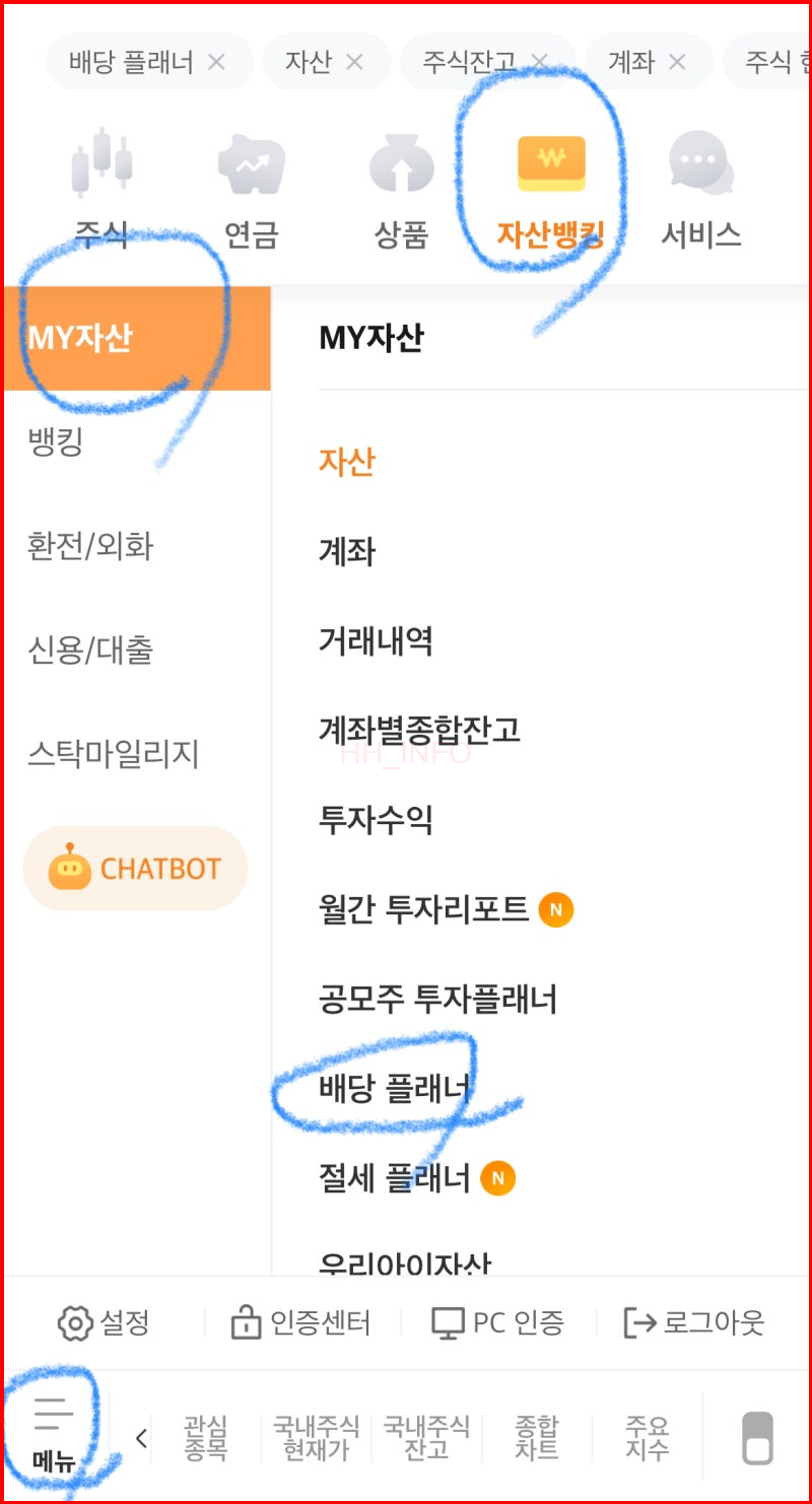 - 자산뱅킹 → 마이자산 → 배당플래너 메뉴를 선택합니다.