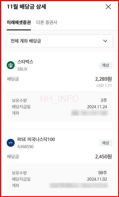 미래에셋증권은 월별 배당금액을 확인할 수 있어 배당금 관리가 편리합니다. 또한, 해외 주식과 연금계좌의 배당금액을 한눈에 확인할 수 있어 매우 직관적입니다. 달을 선택하면 상세 내역에서 각 종목의 배당금액을 확인할 수 있습니다.