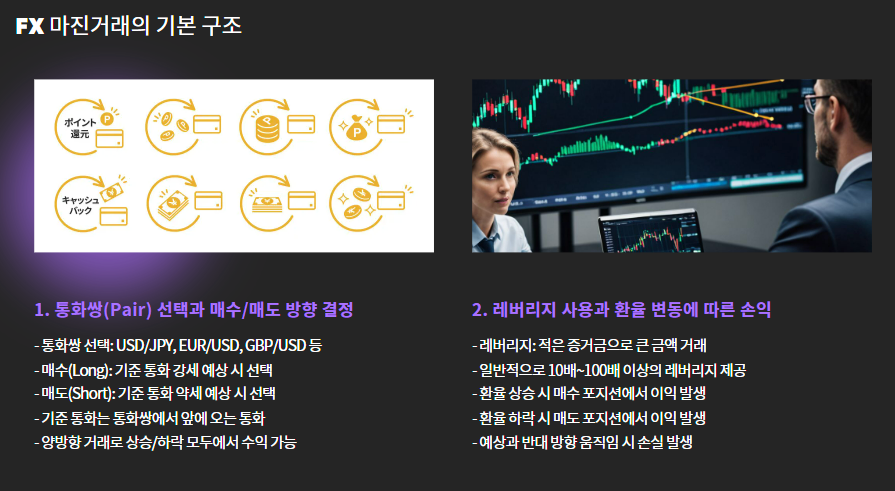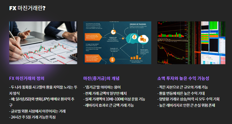 FX 마진거래(Foreign Exchange Margin Trading)는 두 나라의 통화를 사고팔아 환율 차익을 노리는 투자 방식입니다.