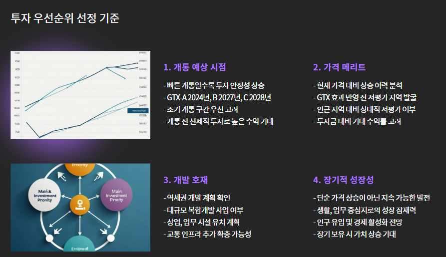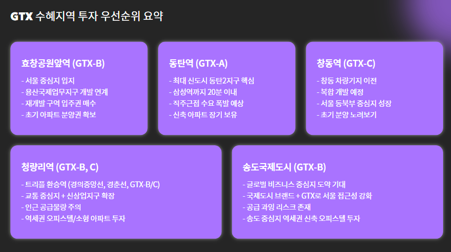 GTX는 분명 수도권 부동산 시장의 ‘게임 체인저’입니다. 하지만 모든 GTX 역세권이 똑같은 성과를 내지는 않습니다. 투자 타이밍과 지역 선별이 중요하죠. 오늘은 GTX A, B, C 노선의 주요 수혜지역을 대상으로, 투자 우선순위를 객관적으로 추천해드리겠습니다.