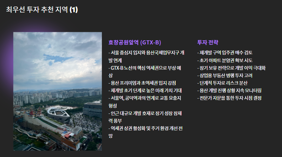 | 1 | 효창공원앞역 | 서울 중심 + 용산 개발 | 재개발 입주권 확보 |