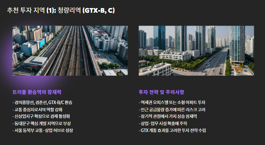 | 4 | 청량리역 | 트리플 환승 + 상업지구 | 오피스텔/소형 아파트 투자 |