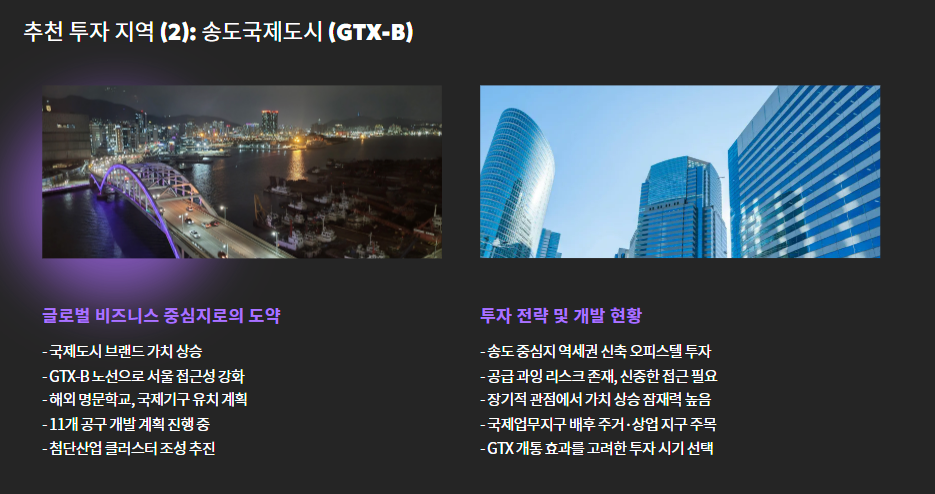 - 장점: 국제도시 브랜드 + GTX로 서울 접근성 강화