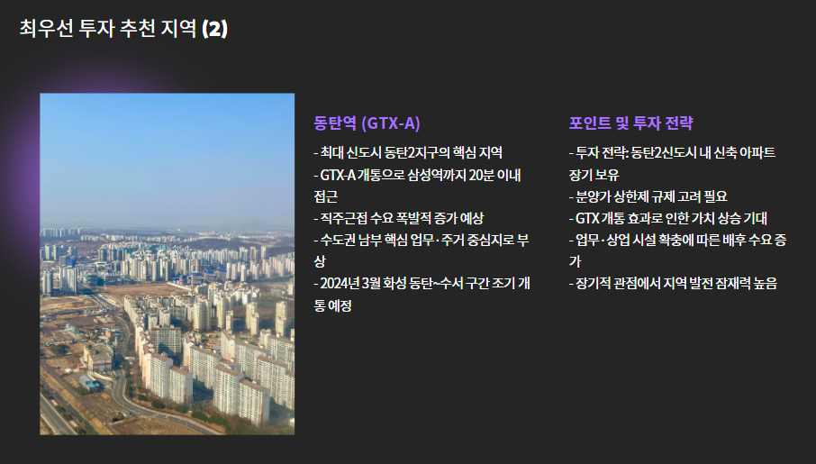 | 2 | 동탄역 | 직주근접 최강 | 신축 아파트 장기 보유 |