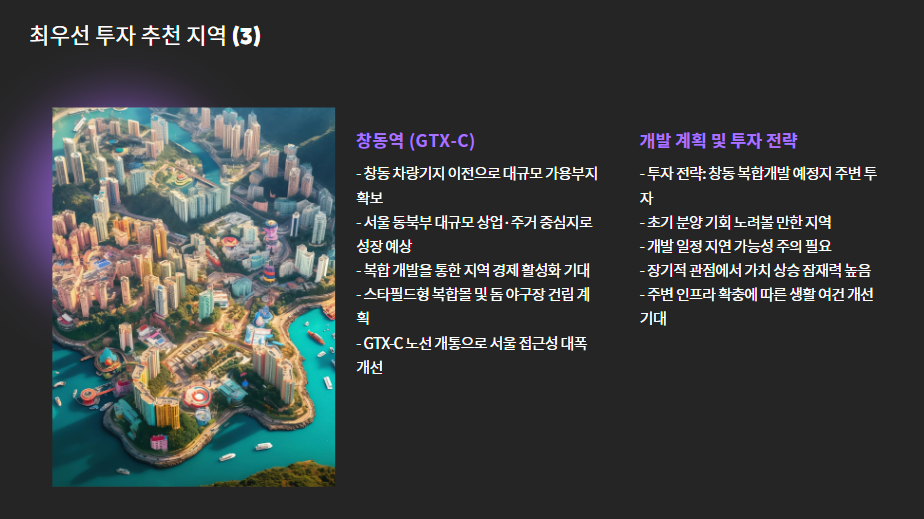 - 투자 전략: 창동 복합개발 예정지 주변 투자 또는 초기 분양 노려보기