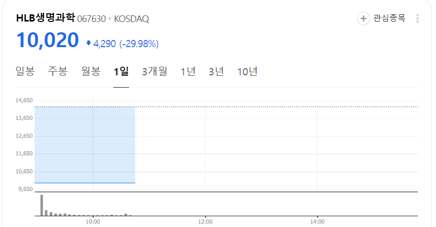 [CBC뉴스] 간암 신약 승인 불발의 여파가 큰 것 같다. HLB생명과학(067630)이 VI가 발동했다. HLB생명과학은 하한가인 상황이다.17일 오전 10시15분 현재 4290원 하락한 1020원이다. 이는 전일보다 무려 29.9