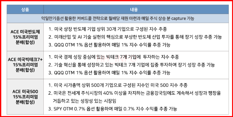 이 ETF 시리즈는 커버드콜 전략을 적용하여 운용됩니다. 커버드콜이란 주식이나 채권을 보유하면서 이를 살 수 있는 콜옵션을 매도하는 전략입니다. 이는 투자자에게 추가적인 프리미엄 수익을 제공하지만, 주가 하락 시 손실을 감수해야 한다는 점에서 주의가 필요합니다.
