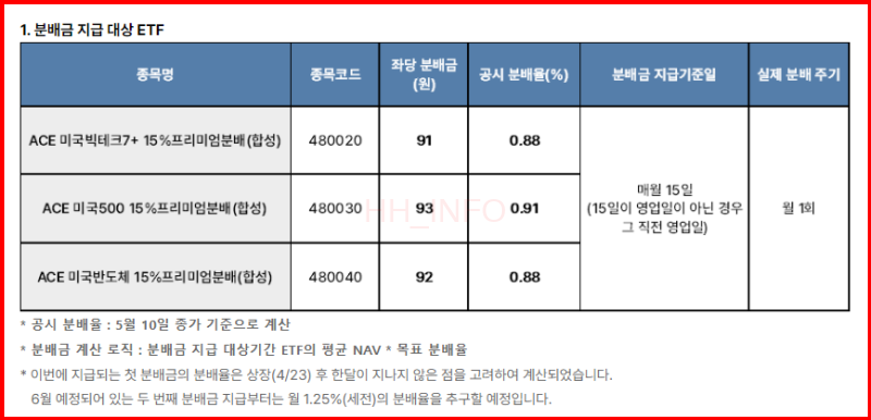 ACE 미국주식 15% 프리미엄 분배 ETF 시리즈는 매월 콜옵션 프리미엄을 수령하여 월간 배당에 필요한 자금을 마련합니다. 최근 분배금은 다음과 같습니다: