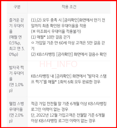 3.1 매일 걸음 수에 따른 우대이율 혜택 하루 3,334보 이상 걸으면 3% 우대 매월 걸음 수 확인 시 1% 추가 우대 3.2 KB스타뱅킹 로그인 이력에 따른 우대이율 혜택 적금 가입 전전월 말 기준 6개월 이상 로그인 이력 없으면 2% 우대