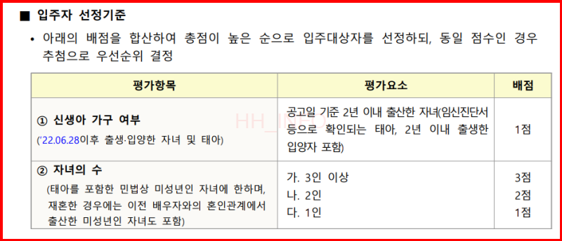- 신생아 가구 여부: 1점 (2년 이내 출산 자녀 및 입양자 포함)