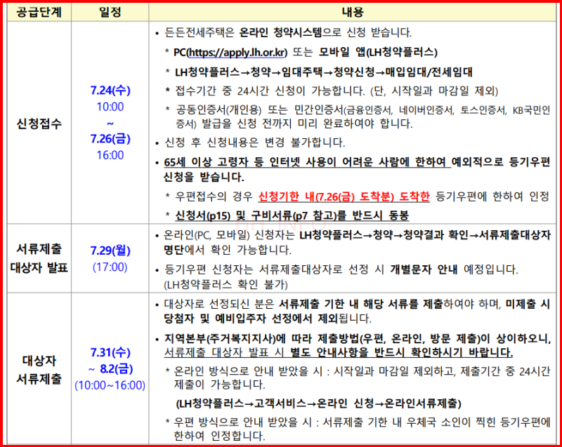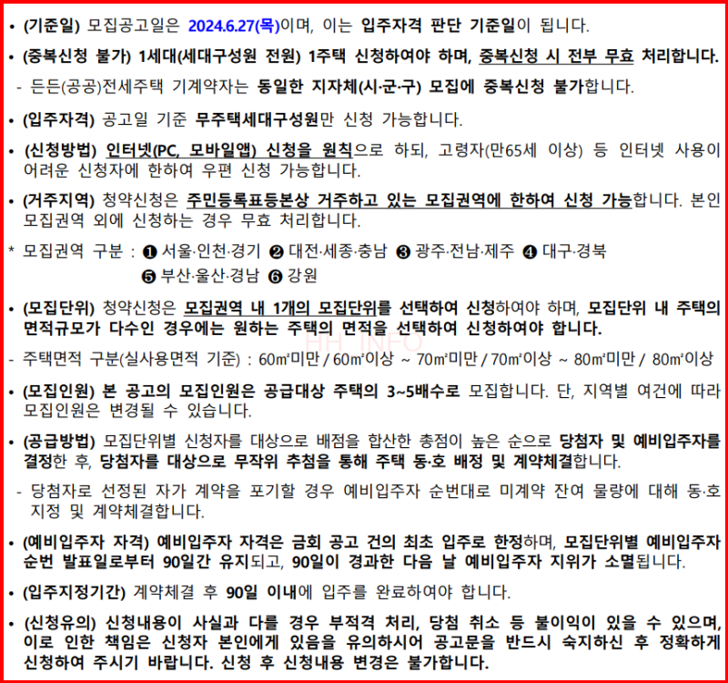 - 중복신청 불가: 1세대(세대구성원 전원) 1주택 신청만 가능하며, 중복 신청 시 무효