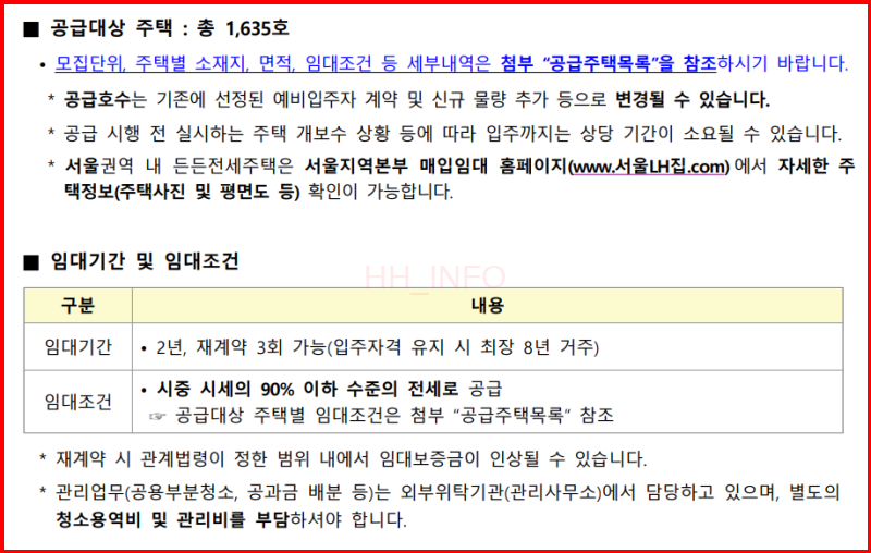 이번 LH 든든전세 공급대상 주택은 총 1,635호입니다. 서울권역 내 든든전세주택은 서울LH집에서 주택사진, 평면도를 확인할 수 있습니다. 임대기간은 2년이며 재계약 3회 가능, 최장 8년까지 거주할 수 있습니다. 임대조건은 시중 시세의 90% 이하 수준입니다.