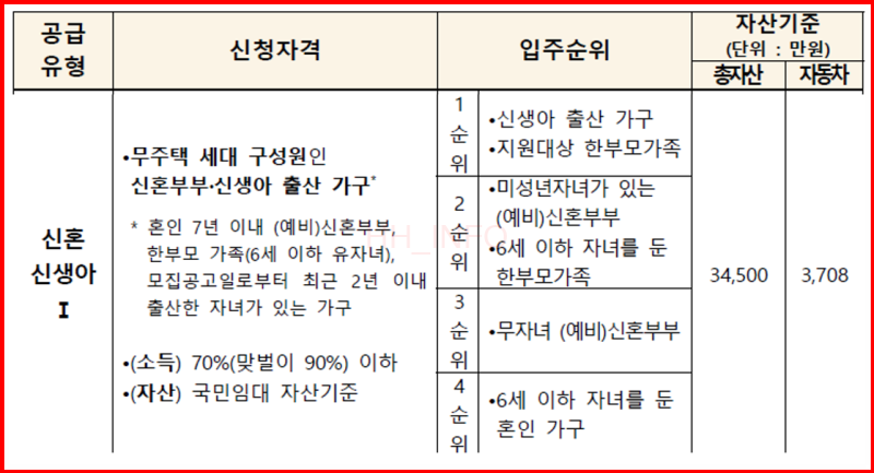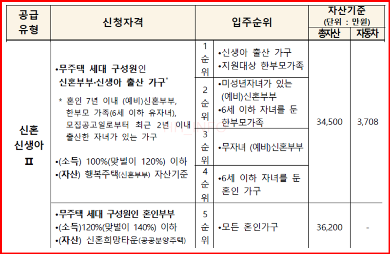 - 신혼부부 1유형: 혼인신고 기준 7년 이내, 또는 예비 신혼부부가 대상이며, 외벌이의 경우 중위소득 70%, 맞벌이는 중위소득 90%를 기준으로 합니다.