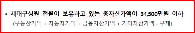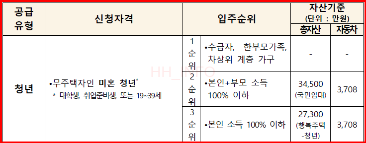 - 청년: 무주택자인 미혼 청년(만 19세~39세)으로 중위소득 100% 이하, 자산 34,500만 원 이하, 보유 차량 가액이 3,708만 원 이하인 경우 지원할 수 있습니다.