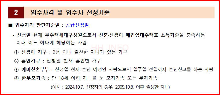 - 신혼부부 2유형: 외벌이의 경우 중위소득 100%, 맞벌이는 120% 이하인 경우 지원할 수 있으며, 소득 기준이 1유형보다 다소 완화되었습니다.