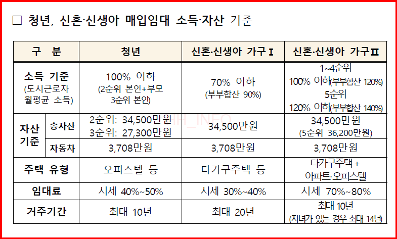 매입임대주택은 3가지 유형으로 나뉘어 있습니다. 각각 청년, 신혼부부/신생아 가구 1유형, 신혼부부/신생아 가구 2유형입니다. 각 유형별로 소득 및 재산 기준을 충족해야 지원할 수 있습니다.