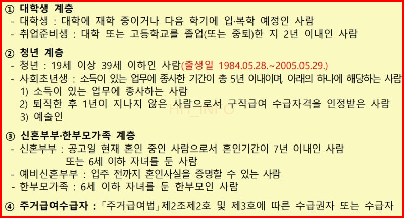 계층에 따라 소득 요건이 다르게 적용됩니다. 대학생은 가구원수의 월평균 소득 합계 100% 이하, 청년은 세대주인 경우 100% 이하, 신혼부부는 홑벌이 기준 100% 이하, 주거급여수급자는 무주택세대구성원이어야 합니다.