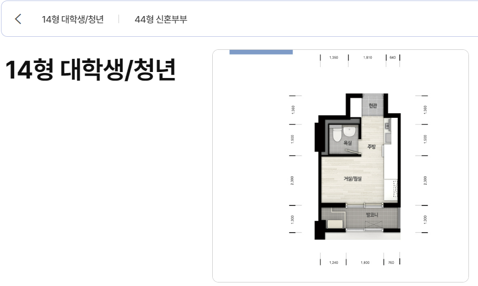 - 대학생/청년: 전용 16/17타입, 월 임대료 14만원 내외