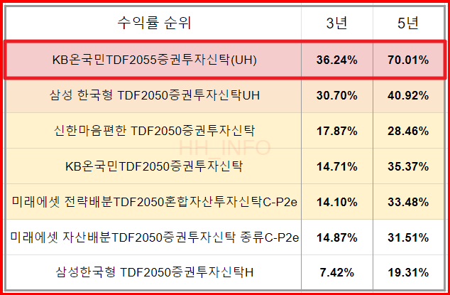 KB 온국민 TDF 2055의 수수료는 가장 저렴하며, 3년 수익률은 뛰어납니다. UH 펀드의 안정성을 고려하여 투자할 필요가 있습니다.