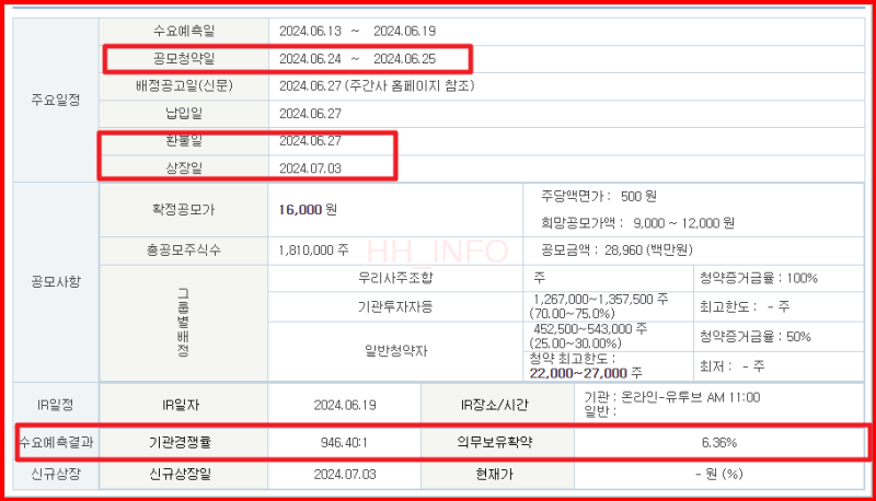 의무보유확약률은 6.36%로, 올해 평균인 10%에 비해 낮은 수치예요.