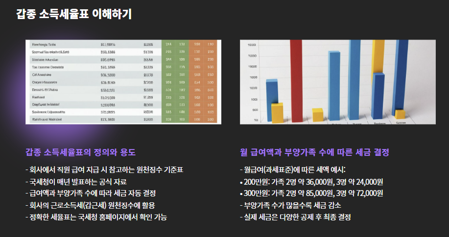 갑종 소득세율표는 회사에서 직원에게 급여를 줄 때 참고하는 원천징수 기준표입니다.