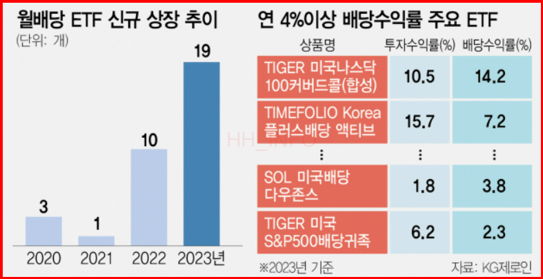 국내 월 배당 ETF는 총 59개에 달합니다. 2023년에는 19개의 신규 월 배당 ETF가 상장되었으며, 기존의 분기/연배당을 주던 ETF들도 월 배당으로 전환하였습니다.