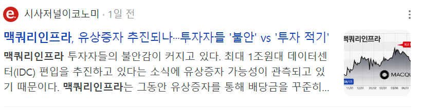 [시사저널e=이승용 기자] 맥쿼리인프라 투자자들의 불안감이 커지고 있다. 최대 1조원대 데이터센터(IDC) 편입을 추진하고 있다는 소식에 유상증자 가능성이 관측되