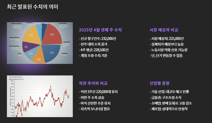 예시로, 2025년 4월 넷째 주 기준 신규 실업수당 청구건수는 232,000건으로 발표되었습니다. 이는 시장 예상치인 225,000건보다 소폭 높은 수준입니다.