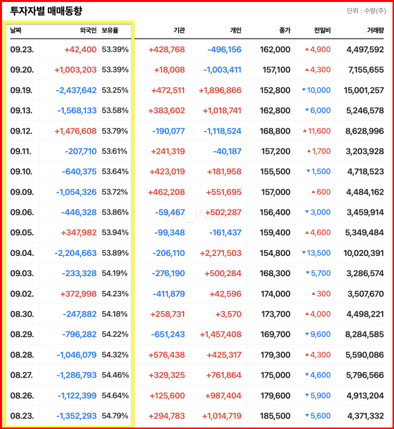 외국인은 8월 23일 이후 꾸준히 삼성전자의 주식을 매도하고 있습니다. 반면 개인 투자자들은 외국인의 매도 물량을 계속해서 매수하고 있지만, 외국인의 지속적인 매도세로 주가는 더 이상 버티지 못하고 하락하고 있습니다. 외국인의 보유율은 한 달 사이에 56%에서 54%로 줄었으며, 이는 삼성전자의 시가총액이 91조원 가량 감소한 결과를 가져왔습니다.