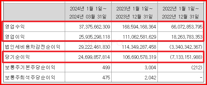 시프트업의 2022년 영업수익은 660억 원이었으나, 2023년에는 1,680억 원으로 두 배 이상 증가했습니다. 또한, 2022년에는 마이너스였던 순이익이 2023년에는 무려 1,067억 원으로 급증했습니다. 2024년도 매출액은 아직 전년도에 미치지 못하고 있지만, 4월에 출시된 '스텔라블레이드'의 매출이 추가되면 좋은 결과가 예상됩니다.