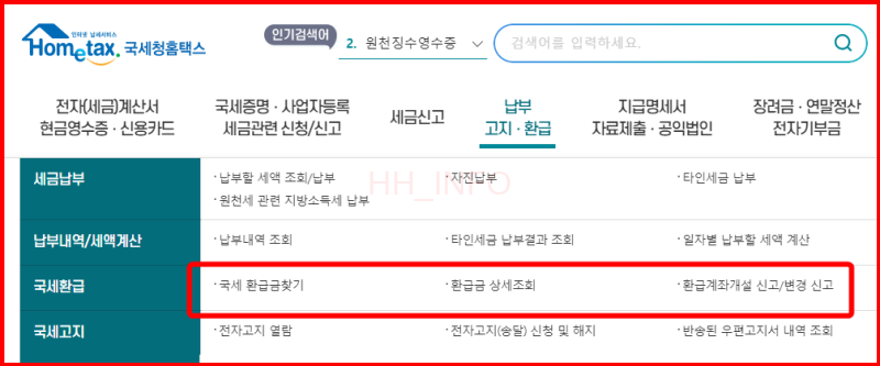- 납부/고지/환급 메뉴 선택: 상단 메뉴에서 "납부/고지/환급"을 클릭합니다.