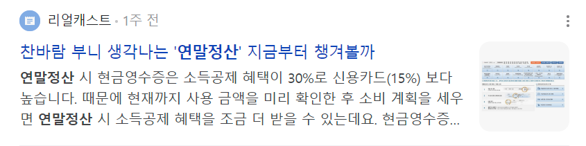 연말정산 시 현금영수증은 소득공제 혜택이 30%로 신용카드(15%) 보다 높습니다. 때문에 현재까지 사용 금액을 미리 확인한 후 소비 계획을 세우면 연말정산 시 소득공제 혜택을 조금 더 받을 수