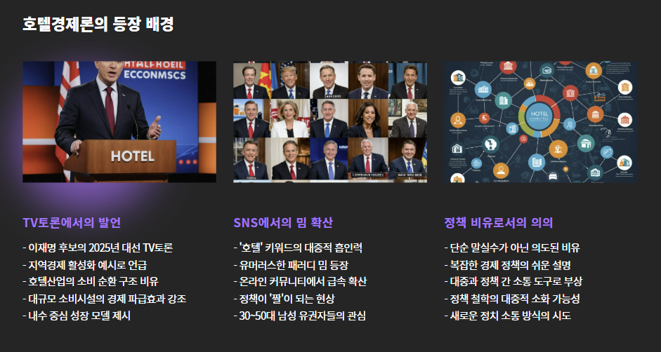 ‘호텔경제론’이란 말은 이재명 후보가 지역경제 활성화 및 내수 중심 성장의 예시로 호텔산업의 소비 순환 구조를 비유하면서 나온 표현입니다.