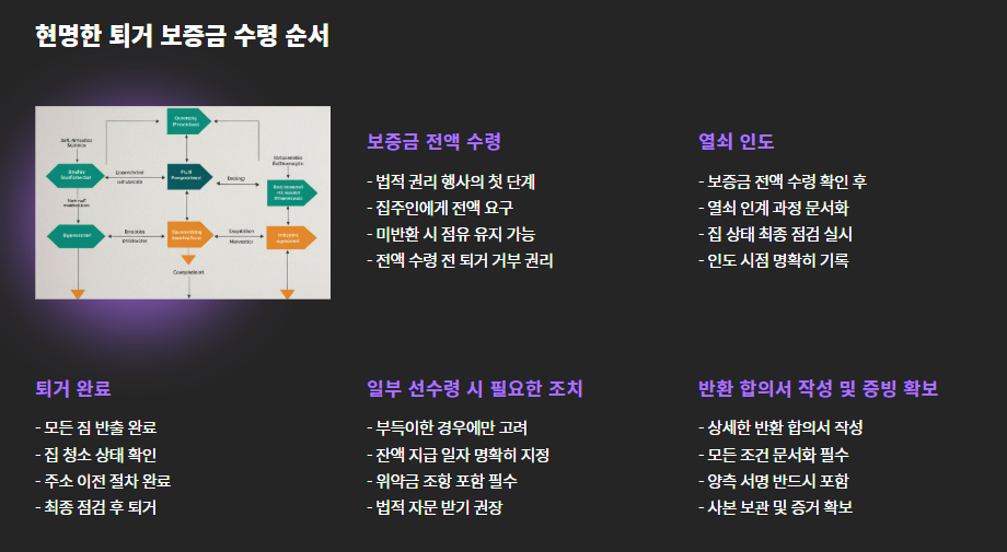 - 보증금 전액 수령 → 2. 열쇠 인도 → 3. 퇴거 완료