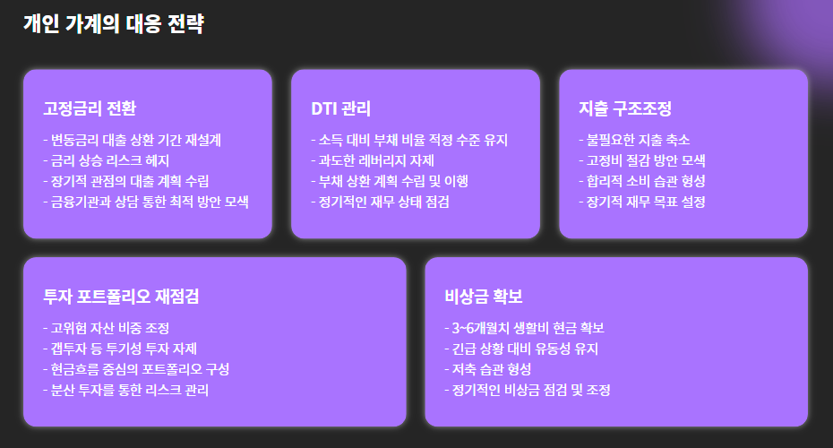 - 고정금리 전환 고려: 변동금리 대출자라면 상환 기간 재설계